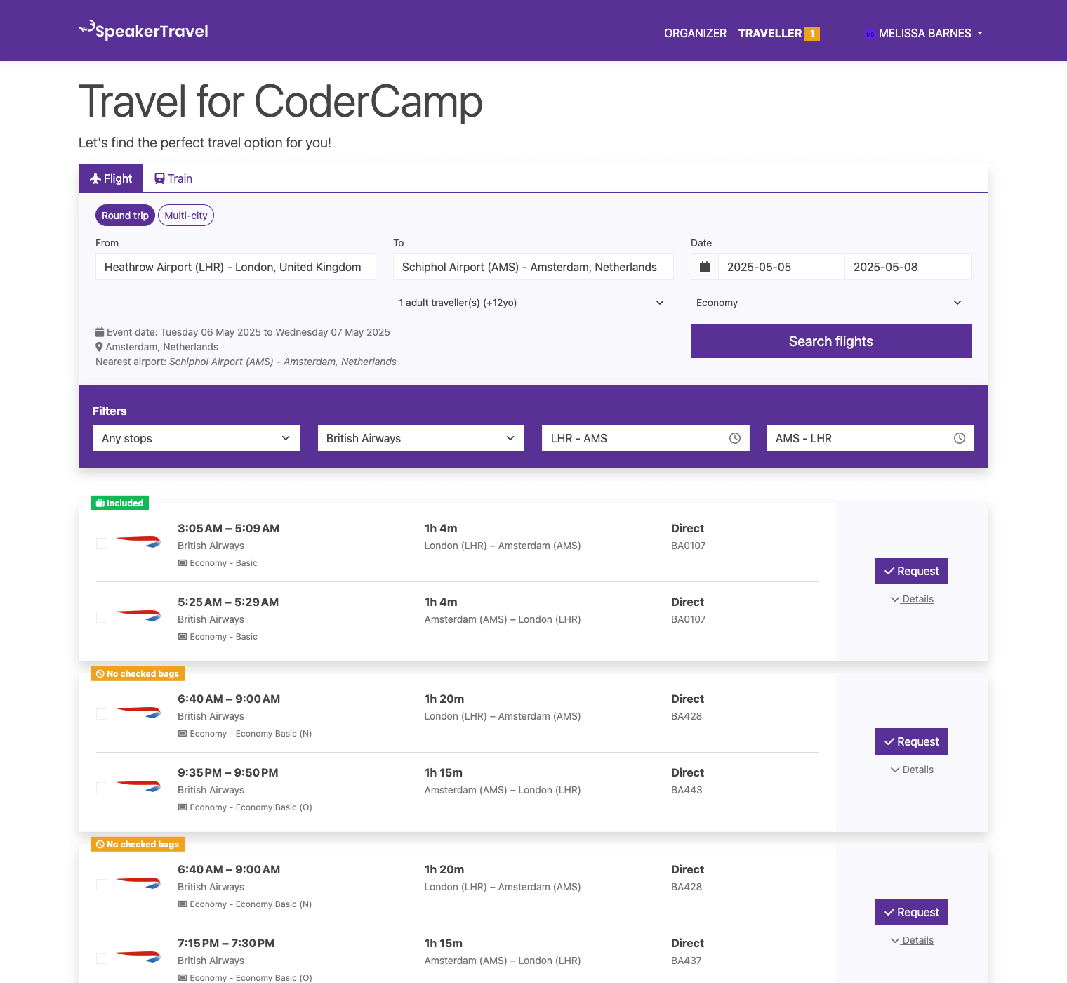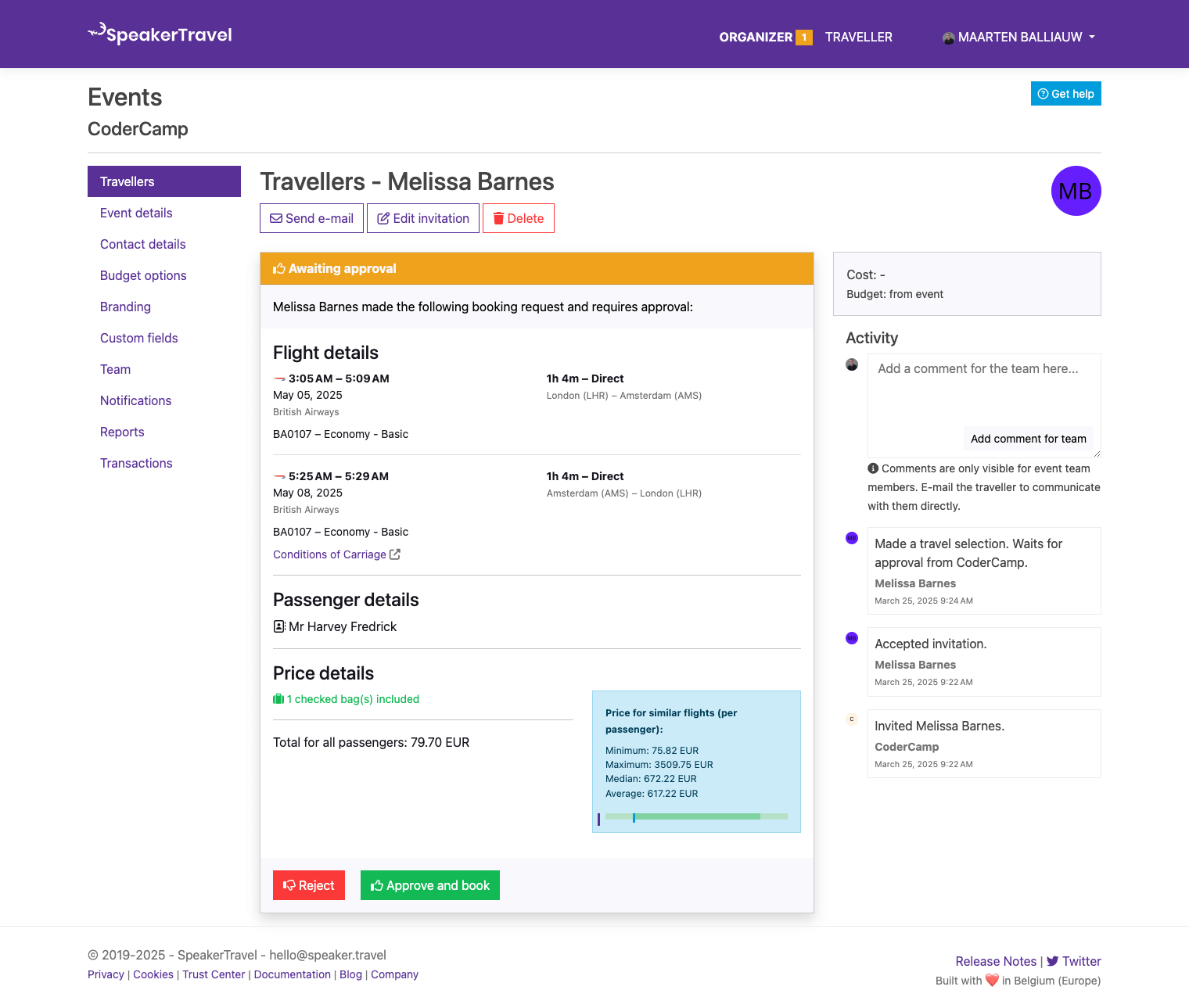 Once a traveller makes a booking request, the organizer will need to approve it. You can review the selected flight(s), train(s), booking class, and price information.
