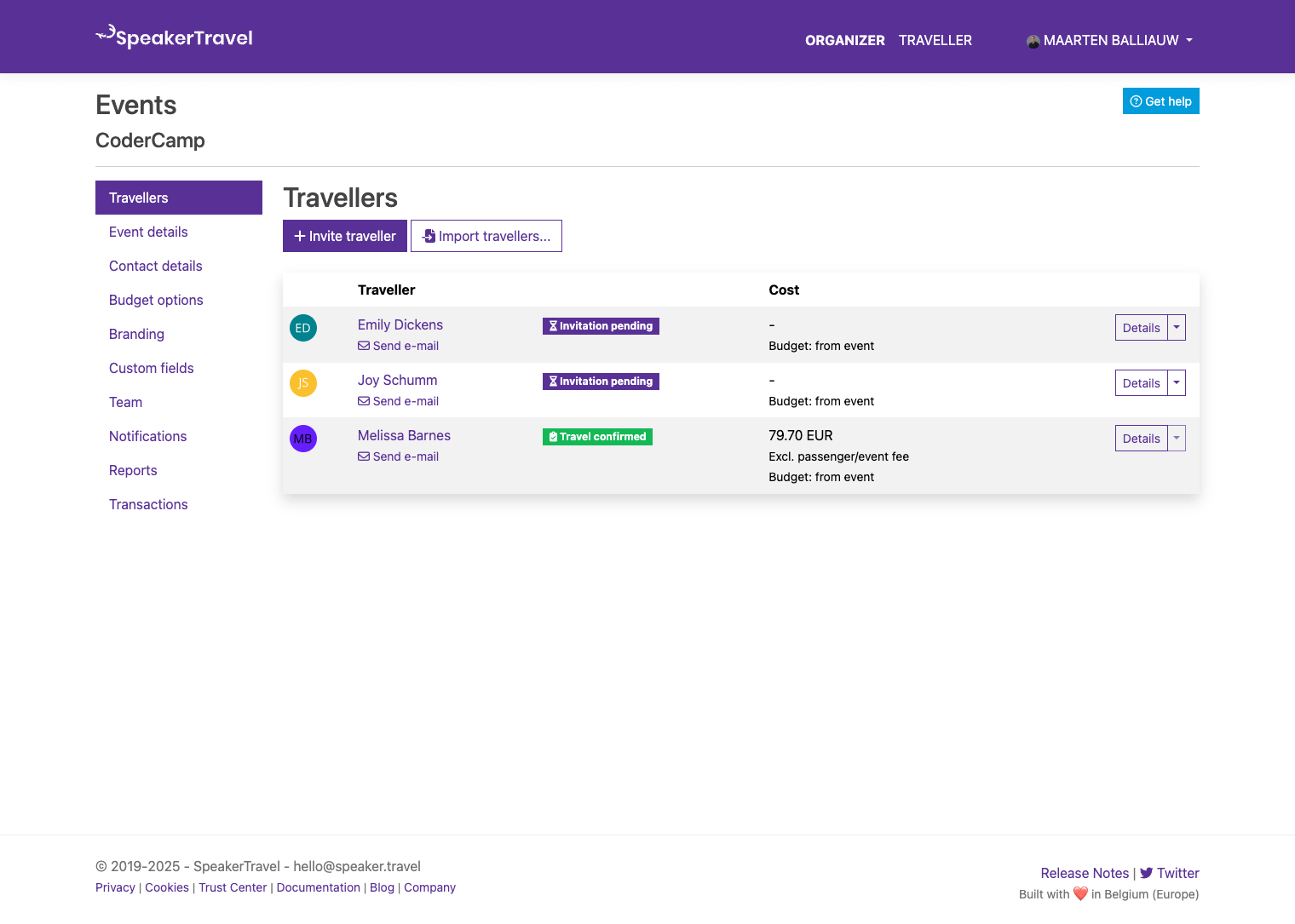 Once travellers have been invited, you can see all traveller invitations. The travellers list will show their status (invited, waiting for approval, confirmed, ...), and provides a quick overview of amount spent on fares vs. their budget.
